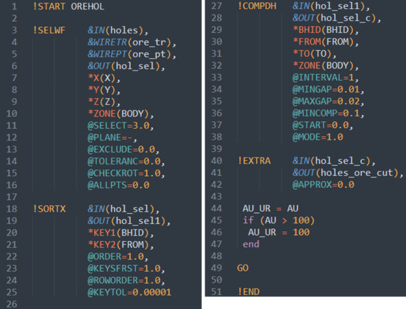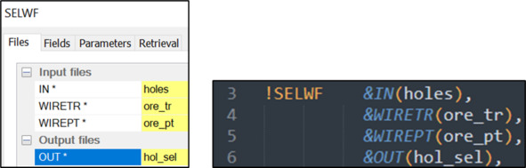 – на строке 6 указано, что выходным файлом для процесса SELWF является файл holes_ore_cut – &OUT (holes_ore_cut).