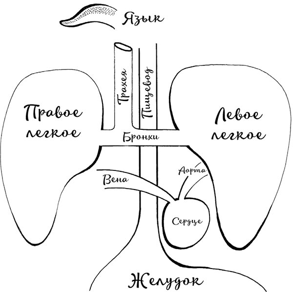 Таким образом, пищевод – это транзитная соединительная трубка, которая нужна для того, чтобы пища перемещалась из полости рта в желудок. Рядом с пищеводом расположены другие органы: сердце слева, легкие с обеих сторон и сеть кровеносных сосудов.