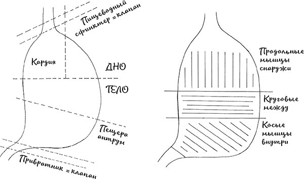 Итак, желудок состоит из нескольких частей. Это дно желудка, которое, как ни странно, расположено в самом верху. Дальше идет тело желудка, которое состоит из двух половинок – из малой части, которая немножечко изгибается, и из большой, самой изогнутой части. И на выходе желудка – так называемый антральный отдел, который заканчивается большой тугой мышцей – привратником. Вообще, надо сказать, что желудок – это целиком и полностью мышечный орган. Если вы когда-нибудь видели или ели куриный желудок, то вы представляете, из какого количества мышц или «мяса» состоит наш желудок. Именно эти несколько слоев мышц: поверхностный, средний и внутренний – обеспечивают его основную функцию – расслабление и сокращение. В желудке даже есть участки, которые, как в сердце, генерируют нервные импульсы, чтобы он сокращался, сжимался или, наоборот, расслаблялся.