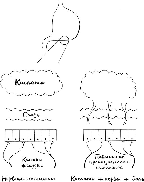 Рис. 16. Слизистая оболочка желудка, кислота, проницаемость и нервные окончания