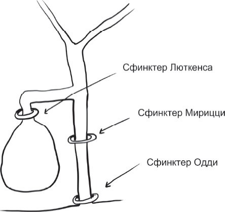 Сфинктер Мирицци – находится примерно в середине общего желчного протока, после того места, где к нему присоединяется желчный пузырь. Он регулирует поступление желчи из печени в пузырь и в протоки, а еще предотвращает затекание желчи обратно в печень.
