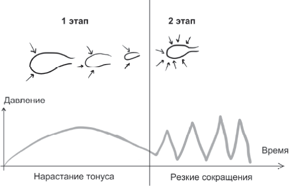 Сначала пузырь равномерно медленно сжимается за счет тонуса, это называется тоническое сокращение желчного. Затем он начинает подергиваться рывками от 2 до 6 раз в минуту. Оба вида сокращения желчного пузыря создают в нем совсем небольшое давление 25 мм рт. ст. Поэтому условно можно считать, что в норме желчь выделяется практически пассивно или самотеком. В остальное время желчный пузырь не сокращается и желчь в кишечник не поступает.