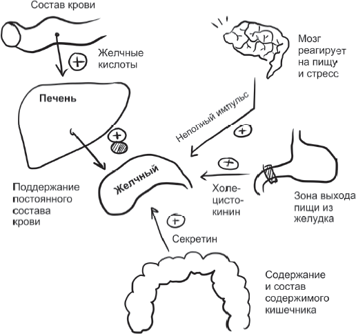 Наш организм работает по принципу обратной связи. Это означает, что везде установлены особые датчики, которые собирают информацию и отправляют в специальные автоматические нервные узлы или зоны головного мозга. Именно они без нашего участия принимают решение о том, что должно происходить с сокращениями желчного пузыря, какой тонус должен быть у желчных протоков и какой состав желчи должны поддерживать клетки печени.