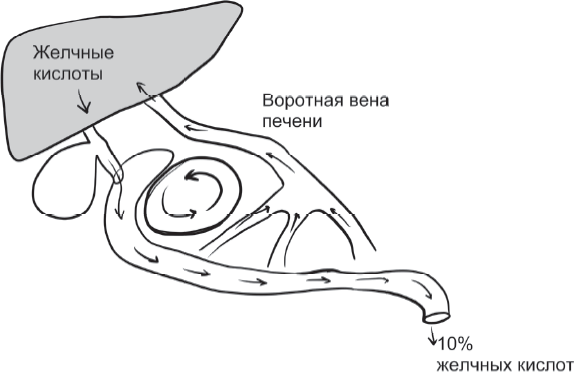 Как мы помним, желчь состоит по большей части из желчных кислот. Их в организме содержится около 3 г, при этом для обработки жиров перед перевариванием их необходимо намного больше. Ежедневно с калом мы теряем около 0,5 г желчных кислот. При употреблении жирной пищи требуется в 5 раз большее количество желчных кислот, однако организм не испытывает дефицита. Происходит так потому, что организм повторно использует старые желчные кислоты и гоняет их по кругу. В итоге общий запас желчных кислот в зависимости от особенностей питания и вкусовых предпочтений проходит от 4 до 12 оборотов повторного использования за сутки. Это получило название энтерогепатической циркуляции желчных кислот.