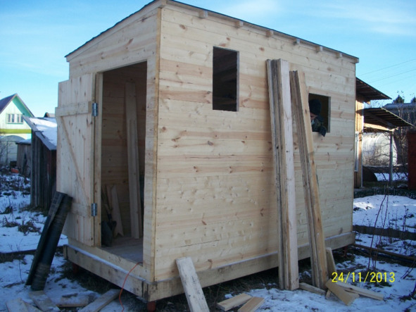 Её я делал из шпунтованной доски уже в ноябре. Это было моё первое строение. Я планировал ещё сделать временный туалет типа «сортир». Но не сделал. Пользовались всю стройку соседским. С разрешения, конечно. Спасибо и низкий поклон. Получилось, что на туалете сэкономили.