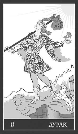 Небольшой узелок Шута – символ начала. Шут еще не накопил ни знаний, ни опыта, ни материальных ценностей. Некоторые тарологи считают, что у Шута в узелке атрибуты Мага – жезл, меч, кубок и пентакль, – но он пока не умеет ими пользоваться. Шут – это чистый лист.