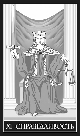 Эта карта изображает Фемиду. Она холодна и рассудочна и вместе с тем наделена чувством гармонии и равновесия. Карте Справедливость свойственны объективность, тяготение к порядку, стремление установить связь между духом и материей. Справедливость призывает нести ответственность за свои поступки. Человек волен делать все, что хочет, но он должен быть готов к последствиям.