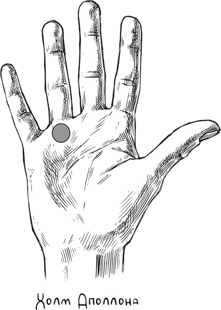 ▸ Ярко выраженный холм Аполлона говорит о незаурядных талантах в искусстве, но также и о растерянности перед каждодневными реальными заботами. Вам хочется парить на крыльях творчества, не касаясь грешной земли, и однажды вы можете заметить, что почва уходит из-под ног. Найти золотую середину между высокими порывами вдохновения и обыденными делами – порой скучными, но необходимыми – ваша задача.