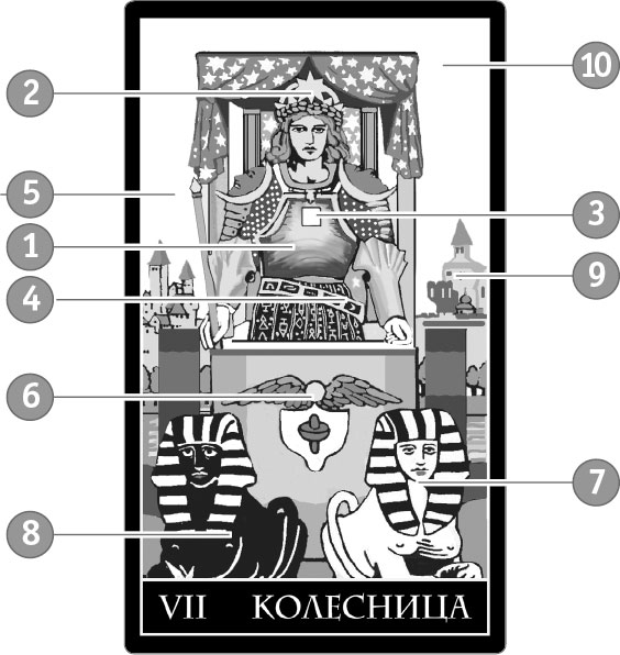 7. Впряженные в колесницу два сфинкса – энергия, движущая сила, позволяющая достигать целей. Согласно легенде, сфинкс сидел на входе в Фивы и загадывал загадку всякому входящему. Тот, кто не мог разгадать загадку, платил за это жизнью. Возничий не только разгадал загадку, но и запряг сфинксов в колесницу – это триумф разума. Теперь они помогают герою двигаться дальше, покорять новые вершины, побеждать.