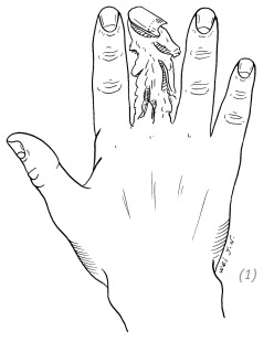 (1) тяжёлое повреждение указательного, среднего, безымянного пальцев, мизинца и ладони кисти вследствие тяжёлой компрессии; (2) после очищения раны, насколько возможно, сохраняется часть указательного пальца, чтобы помочь большому пальцу восстановить зажимную функциональность