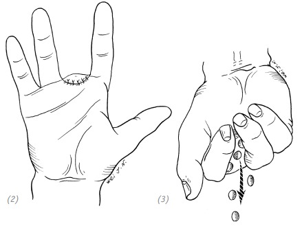 (2), (3) после ампутации 3-го пальца на уровне проксимальной фаланги при захвате мелких предметов они легко просачиваются сквозь промежуток на месте ампутированного пальца