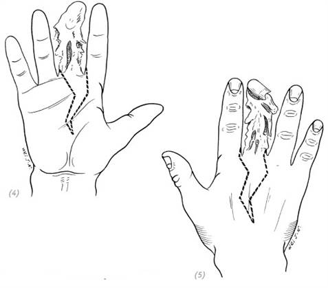 Рис. 5–5. Повреждение среднего пальца вследствие тяжёлой компрессии, ампутация пястно-фаланговых суставов или проксимальной фаланги пальца