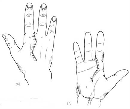 (6), (7) после ампутации выполняется сшивание межкостных мышц, поперечных связок между головками 2 и 4 пястных костей и кожи. После ампутации пальца до основания пястной кости обретается красивый внешний вид