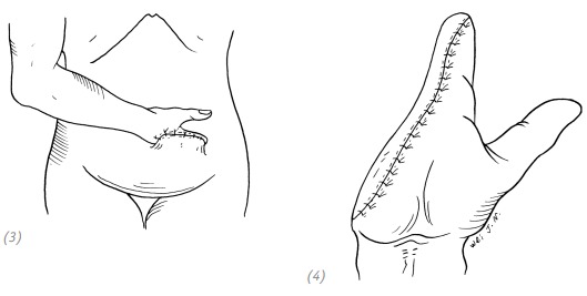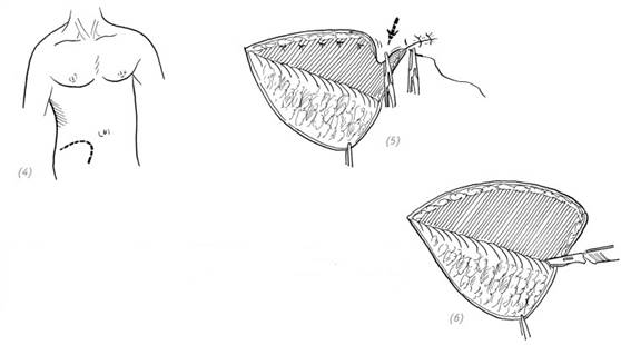 (4) с той же стороны в нижней части живота вырезается кожный лоскут в соответствии с размером и формой повреждённой поверхности кисти; (5) кожный лоскут поднимается и соответствующим образом истончается; (6) поражённая поверхность донорского участка в области живота ушивается с края, чтобы максимально уменьшить поверхность раны