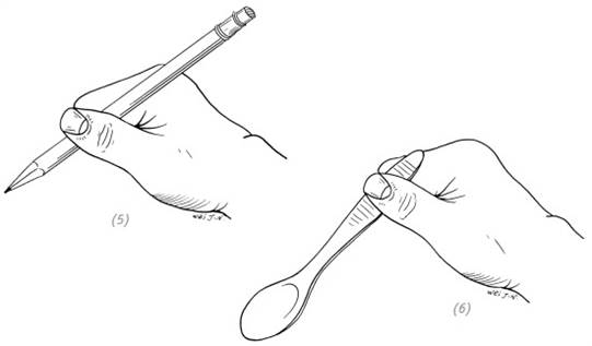 (5), (6) функциональные возможности сохранённого большого пальца и культи указательного пальца после операции на травмированной руке: можно писать и держать столовые принадлежности.