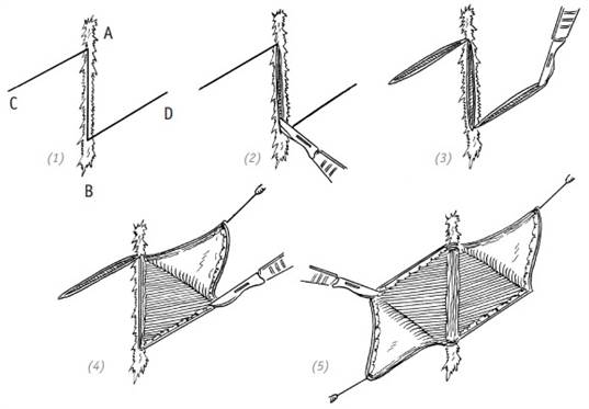 (1)– (5) в качестве оси выступает линия рубца, ставшего причиной контрактуры – отрезок АВ, проектирование двух треугольных кожных лоскутов CAB и DBA