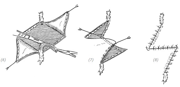 3. Сформировать треугольные лоскуты, удалить рубцовую ткань и ушить рану, предварительно выполнив перемещение треугольных лоскутов. При сшивании вершин треугольных лоскутов игла должна быть введена с одной стороны, противолежащей лоскуту в вершине принимающей стороны, пройти под кожей вершины треугольного лоскута, а затем выйти с другой стороны, противолежащей лоскуту (прим. редактора: шов по типу Альговера) (рис. 6–2).