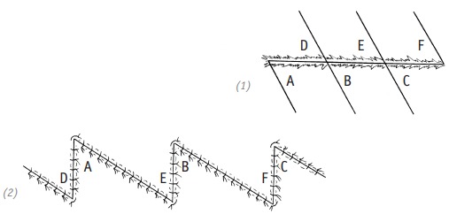 (1) в качестве оси выступает линия рубца, вызвавшего контрактуру, проектирование разрезов нескольких Z-пластик; (2) после формирования размера лоскутов каждая группа треугольных кожных лоскутов взаимно перемещается (A и D, B и E, C и F), удлиняя рубец, ставший причиной контрактуры