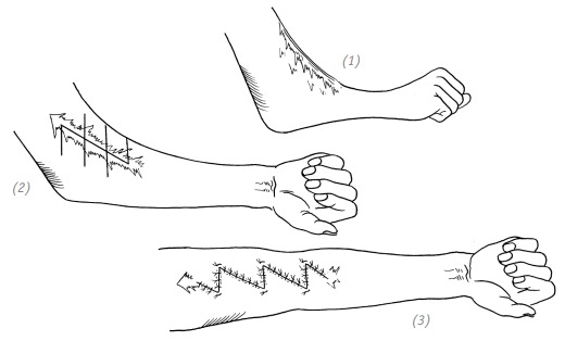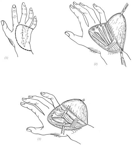 1.Одну из частей тыльной стороны кисти используют в качестве ножки (обычно это локтевая сторона) и вырезают кожный лоскут в области рубца на кисти, который должен быть по размеру значительно больше, чем границы рубца.