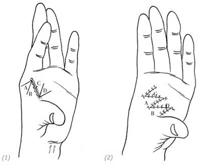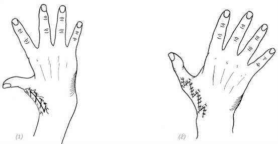(1) проектирование разрезов; (2) зашивание кожных лоскутов после перемещения при лечении рубцовой контрактуры межпальцевого пространства между большим и указательным пальцами