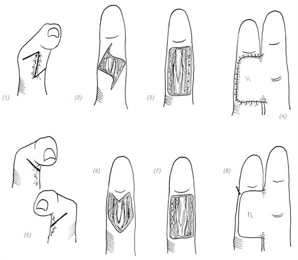 (3) культя указательного пальца и рана на локтевой стороне ладони восстанавливаются брюшным лоскутом; (4) после перерезания ножки