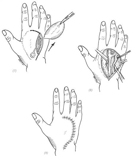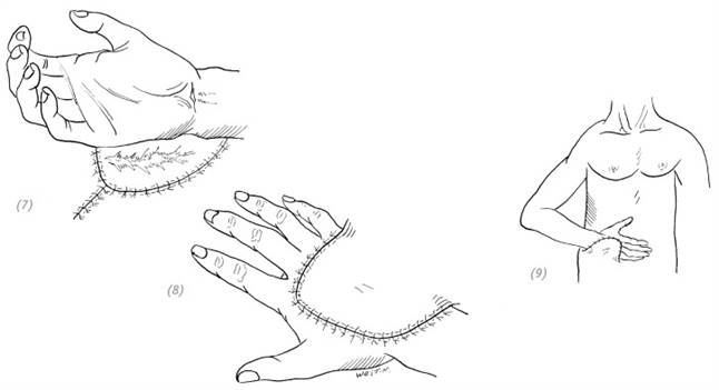 (7) пришивание рубцового лоскута с тыльной стороны кисти к повреждённой поверхности донорской кожи лоскута живота; (8) зашивание брюшного лоскута на тыльной стороне кисти; (9) после операции поражённая конечность фиксируется лейкопластырем и бандажом. Особое внимание уделяется кровоснабжению двух полнослойных кожных лоскутов
