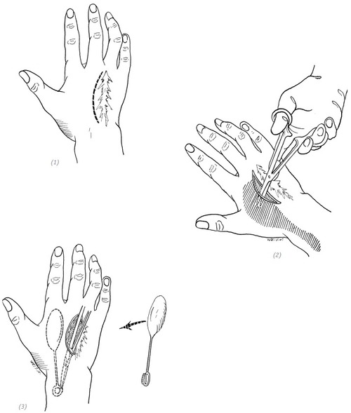 (1) формирование лоскута с рубцом на тыльной стороне кисти; (2) поднятие кожного лоскута в области рубца на кисти, сохранение как можно большего объёма подкожной или рубцовой ткани; (3) сросшиеся сухожилия могут быть полностью освобождены от рубцов под контролем глаза во время операции