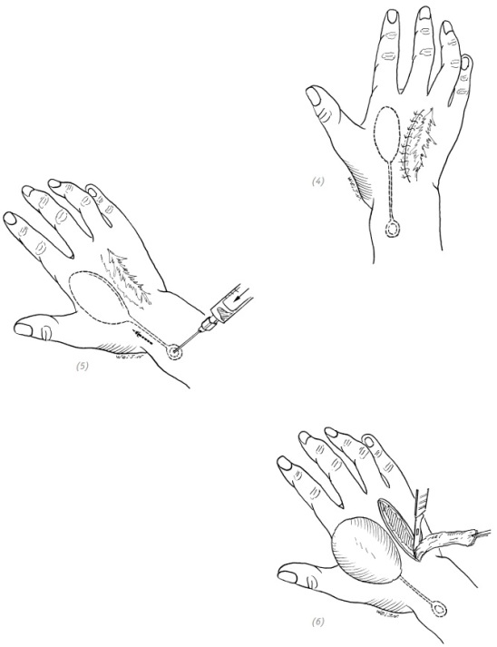 (1) рубец на тыльной стороне кисти и хирургический разрез. Разрез должен быть на нормальной коже рядом с рубцом; (2) отделение подкожной ткани большим сосудистым зажимом, чтобы можно было ввести силиконовый экспандер; (3) в зависимости от требуемого размера восстановления повреждённой поверхности после удаления рубца вставляется необходимый силиконовый экспандер объёмом 80~120 мл, при этом капсула для инъекций должна находиться на удалении от силиконового расширителя