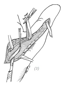 (4) используя сосудистый зажим, протаскивают свободное сухожилие в соответствующее влагалище