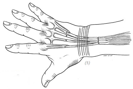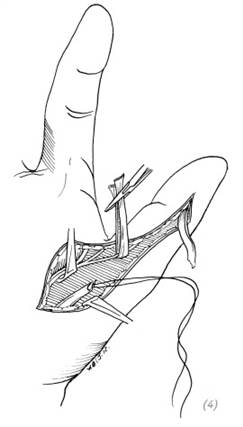(1) разрез; (2) метод свободной трансплантации сухожилия нескольких пальцев такой же, как и метод, описанный выше; (3) при операции натяжение шва пересаженного сухожилия должно быть в положении покоя для каждого пальца (прим. редактора: среднее физиологическое положение)