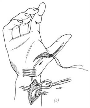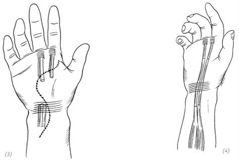(3), (4) если повреждения сухожилия сгибателя возникли в запястье и ладони, следует избегать наложения шва на сухожилия в запястном канале. Тогда следует удалить проксимальный и дистальный участки культей сухожилий поверхностных сгибателей пальцев и, используя метод свободной пересадки сухожилия, восстановить функции сухожилий глубоких сгибателей пальцев. Натяжение шва на сухожилии должно осуществляться при нахождении пальца в среднем физиологическом положении