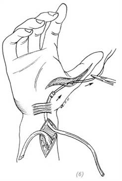(6) через разрезы на тыльной стороне пястно-фалангового сустава и на дистальном конце предплечья находят дистальную и проксимальную культю разорванного сухожилия