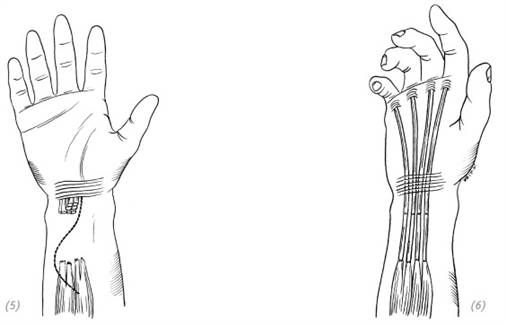 6. Проксимальный конец пересаженного сухожилия и проксимальный конец сухожилия длинного сгибателя большого пальца помещаются в запястном суставе в среднем физиологическом положении и в положении лёгкого сгибания дистальной части большого пальца переплетаются и сшиваются.