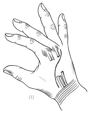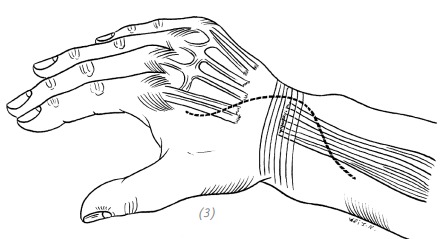 1. Делается срединный разрез на лучевой стороне большого пальца и продляется он до проксимального конца через пястно-фаланговый сустав и тенар, а затем делается дугообразный доступ от проксимального конца поперечных складок запястья.