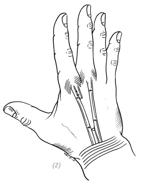 (1), (2) повреждение разгибателей пальцев на тыльной стороне кисти, можно применить свободную пересадку сухожилий для восстановления, натяжение сшитого «конец в конец» сухожилия следует регулировать при нахождении пальцев и пястно-фаланговых суставов в выпрямленном положении