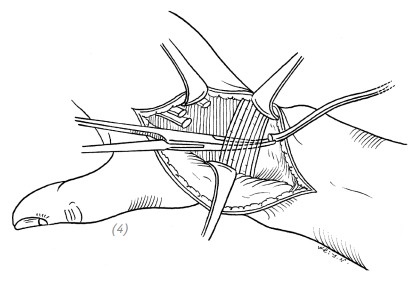 (1) разрез; (2) поиск сосудисто-нервного пучка, подтягивание и его защита. Отчётливое выявление дистального конца сухожилия длинного сгибателя большого пальца