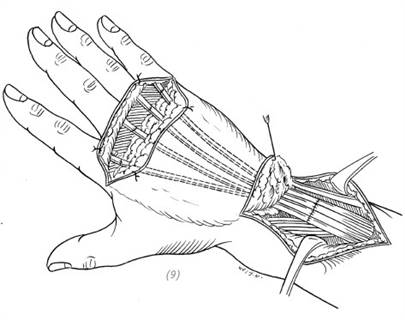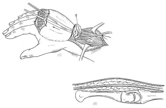 Рис. 7–35. Операция по пересадке сухожилий при повреждении сухожилий сгибателей пальцев вне влагалищ