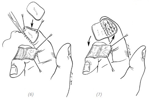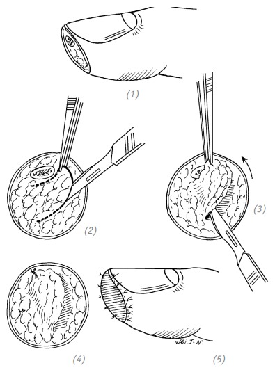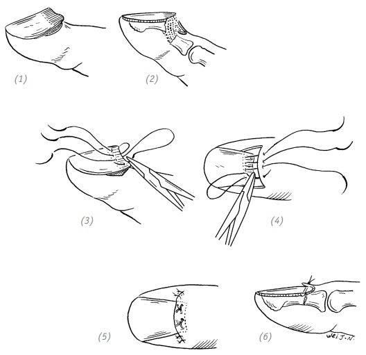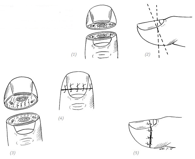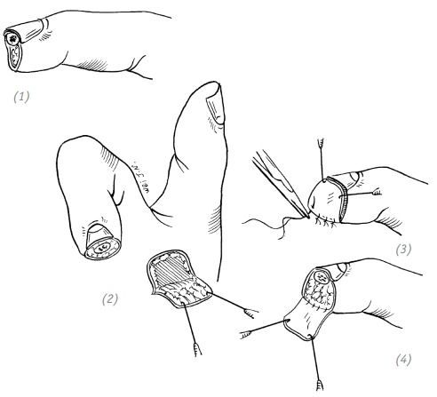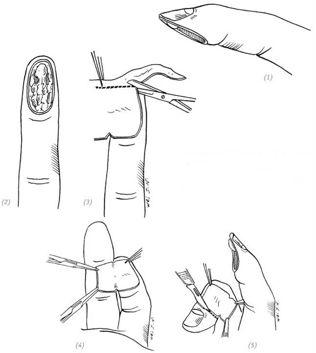(1) дефект кончика (ногтевой фаланги) пальца с обнажением кости малой площади; (2), (3)перемещённый кожный лоскут в зоне рядом с обнажённой костью; (4) кожный лоскут помещают на обнажённую кость и фиксируют одиночным швом; (5) на кончик пальца после кожной пластики накладывают тугую повязку