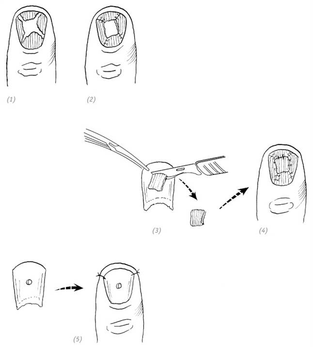(1) рана ногтевого ложа и дефект ногтевого ложа; (2) ушивание раны ногтевого ложа; (3) забор расщеплённого лоскута ногтевого ложа; (4) трансплантация расщеплённого лоскута и подшивание атравматической иглой; (5) использование собственной ногтевой пластины или пластмассовой пластинки для закрытия ногтевого ложа. Предварительно перфорируем для оттока экссудата
