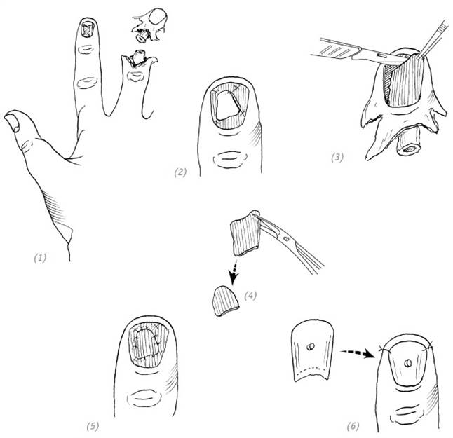 (1), (2) дефект ногтевого ложа; донорский палец с неповреждённым ногтевым ложем; (3), (4), (5) забор лоскута ногтевого ложа с донорского пальца и укрытие дефекта; (6) использование собственной ногтевой пластинки или пластмассовой пластинки для закрытия ногтевого ложа. Предварительно перфорируем для оттока экссудата