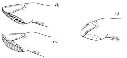 Данный вид операции показан при косых дефектах кончика (ногтевой фаланги) пальца или при дефекте с полным отсутствием ногтевой пластинки.