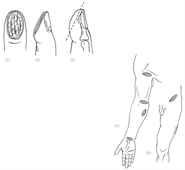 Кожный трансплантат для пересадки при травматических ампутациях кончика (ногтевой фаланги) пальца желательно забирать с той же руки. Лучше всего подходит возвышение большого пальца, соседний палец и т.д. И только при невозможности забора кожного лоскута с вышеперечисленных областей забор производят с кожи предплечья, плеча, груди или передней брюшной стенки.