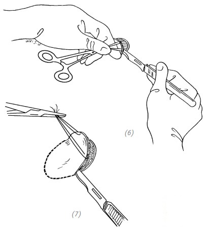 (6), (7) во время забора кожного лоскута для удобства можно наложить на край кожного лоскута швы-«держалки». После чего иссечь кожный лоскут вместе с частью подкожной жировой клетчатки