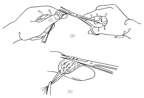 (8), (9) при помощи хирургических ножниц отрезать подкожную жировую клетчатку и в зависимости от необходимости приготовить расщеплённый или полнослойный кожный лоскут средней толщины