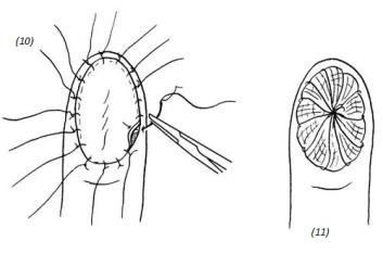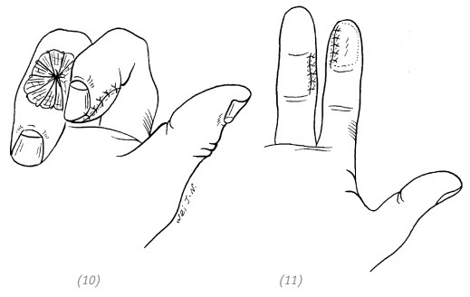 (10), (11) поместить трансплантат на реципиентную зону на кончике пальца и подшить его, оставляя длинные концы лигатур. Затем наложить марлевую салфетку, пропитанную вазелином. Сверху положить мягкую, крупноячеистую марлю либо кусочек поролона и туго перебинтовать