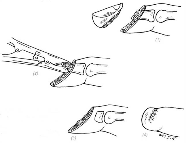 (1) косой дефект кончика (ногтевой фаланги) пальца; дефект с полным отсутствием ногтевой пластинки; (2), (3) полностью иссекаем ногтевое ложе с матрицей ногтя. Костными кусачками удаляем лишнюю часть дистальной фаланги; (4) волярный лоскут подтягиваем на тыльную поверхность и накладываем швы