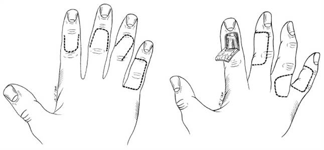 1. Размер лоскута можно определить путём прижатия повреждённого пальца к тенару большого пальца кисти. Размер кровавого отпечатка на коже и есть необходимый размер донорского лоскута. После выкраивания кожного лоскута последний может немного уменьшиться в размере. Чтобы избежать нарушения кровообращения в пересаженном лоскуте, которое может возникнуть в результате избыточного натяжения, разрез кожи необходимо выполнить с отступом 1–1,5 мм от края кровяного отпечатка.
