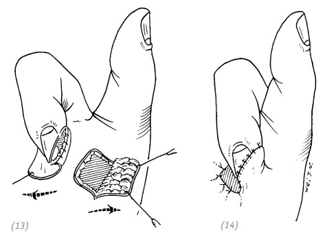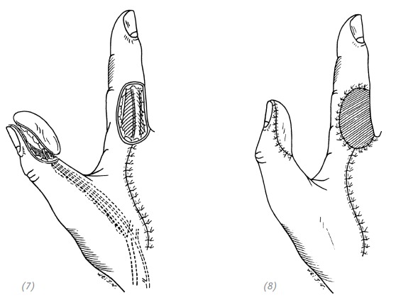 Данная операция применяется для закрытия небольших поперечных дефектов кончика большого пальца. Так как такой кожный лоскут с двух сторон имеет нормальный сосудисто-нервный пучок, то в восстановленном кончике большого пальца будет не только хорошее кровоснабжение, но и нормальная чувствительность.