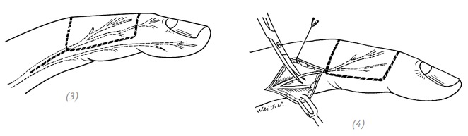 (3), (4) отделяем кожный лоскут и дорсальную ветвь ладонного пальцевого нерва на соседнем пальце