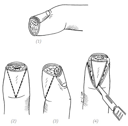 (1) поперечная рана кончика пальца небольшой площади; (2), (3), (4) выкраиваем V-образный лоскут с двух сторон от раневой поверхности до середины дистальной поперечной кожной складки. Рассекаем кожу и не пересекаем подкожные мягкие ткани